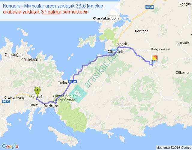 Konacık - Mumcular arası yaklaşık olarak 90 km/h ile yukarıda belirtilen sürede olup, iki yerin kuş uçuşu uzaklığı (mesafesi) 24'dir. Yolculuk otobüsle 48 dakika sürmektedir.