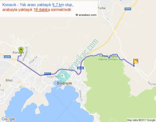 Konacık - Yalı arası yaklaşık olarak 90 km/h ile yukarıda belirtilen sürede olup, iki yerin kuş uçuşu uzaklığı (mesafesi) 7'dir. Yolculuk otobüsle 23 dakika sürmektedir.
