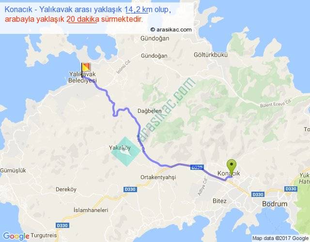 Konacık - Yalıkavak arası yaklaşık olarak 90 km/h ile yukarıda belirtilen sürede olup, iki yerin kuş uçuşu uzaklığı (mesafesi) 11'dir. Yolculuk otobüsle 26 dakika sürmektedir.