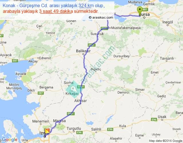 Konak - Gürçeşme Cd. arası yaklaşık olarak 90 km/h ile yukarıda belirtilen sürede olup, iki yerin kuş uçuşu uzaklığı (mesafesi) 252'dir. Eğer belirtilen yerler arasında uçak seferi var ise bu süre uçakla 23 dakika'ya kadar düşebilir. Yolculuk otobüsle 4 saat 57 dakika sürmektedir.