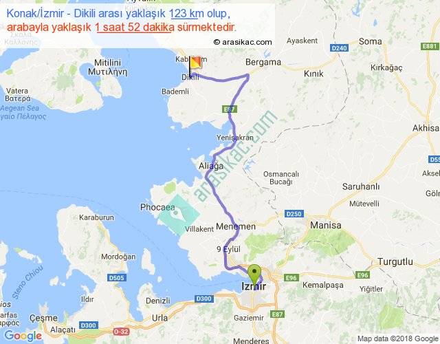 Konak İzmir - Dikili arası yaklaşık olarak 90 km/h ile yukarıda belirtilen sürede olup, iki yerin kuş uçuşu uzaklığı (mesafesi) 76'dir. Yolculuk otobüsle 2 saat 19 dakika sürmektedir.
