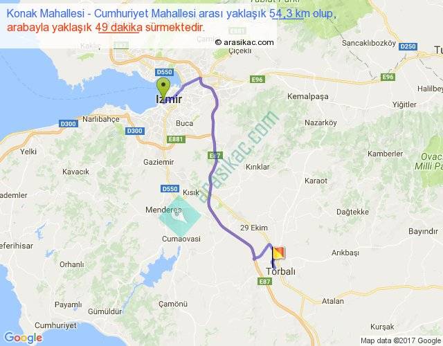 Konak Mahallesi - Cumhuriyet Mahallesi arası yaklaşık olarak 90 km/h ile yukarıda belirtilen sürede olup, iki yerin kuş uçuşu uzaklığı (mesafesi) 34'dir. Yolculuk otobüsle 1 saat 3 dakika sürmektedir.