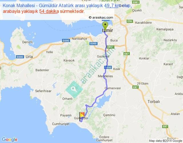 Konak Mahallesi - Gümüldür Atatürk arası yaklaşık olarak 90 km/h ile yukarıda belirtilen sürede olup, iki yerin kuş uçuşu uzaklığı (mesafesi) 39'dir. Yolculuk otobüsle 1 saat 10 dakika sürmektedir.