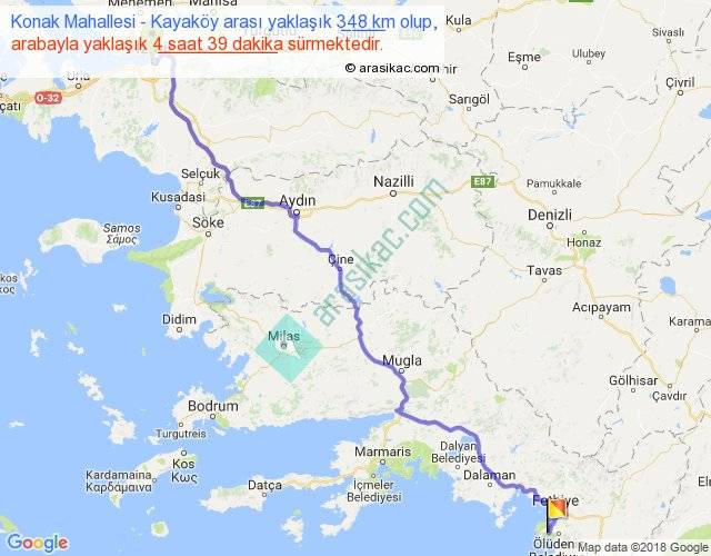 Konak Mahallesi - Kayaköy arası yaklaşık olarak 90 km/h ile yukarıda belirtilen sürede olup, iki yerin kuş uçuşu uzaklığı (mesafesi) 266'dir. Eğer belirtilen yerler arasında uçak seferi var ise bu süre uçakla 24 dakika'ya kadar düşebilir. Yolculuk otobüsle 6 saat 2 dakika sürmektedir.