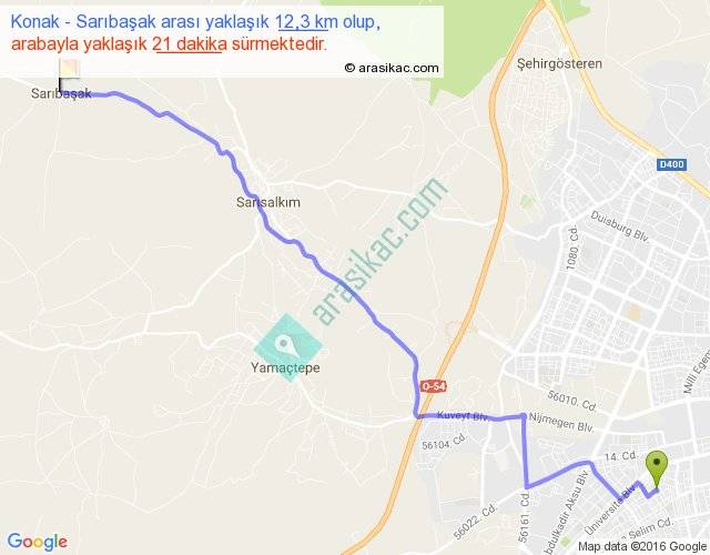Konak - Sarıbaşak arası yaklaşık olarak 90 km/h ile yukarıda belirtilen sürede olup, iki yerin kuş uçuşu uzaklığı (mesafesi) 10'dir. Yolculuk otobüsle 27 dakika sürmektedir.