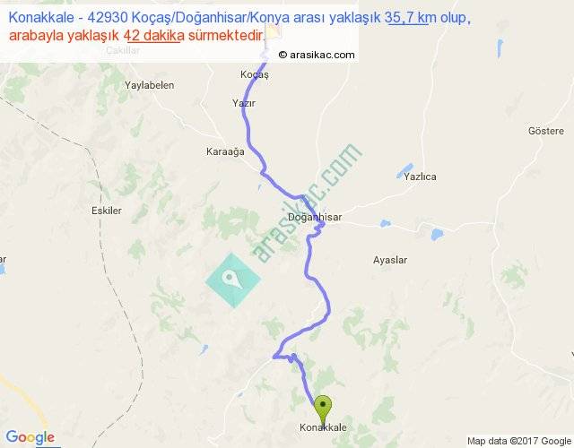 Konakkale - 42930 Koçaş Doğanhisar Konya arası yaklaşık olarak 90 km/h ile yukarıda belirtilen sürede olup, iki yerin kuş uçuşu uzaklığı (mesafesi) 25'dir. Yolculuk otobüsle 54 dakika sürmektedir.