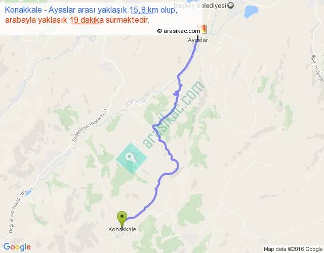 Konakkale - Ayaslar arası yaklaşık olarak 90 km/h ile yukarıda belirtilen sürede olup, iki yerin kuş uçuşu uzaklığı (mesafesi) 12'dir. Yolculuk otobüsle 24 dakika sürmektedir.