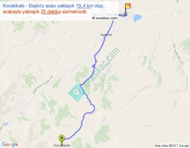 Konakkale - Başköy arası yaklaşık olarak 90 km/h ile yukarıda belirtilen sürede olup, iki yerin kuş uçuşu uzaklığı (mesafesi) 15'dir. Yolculuk otobüsle 32 dakika sürmektedir.