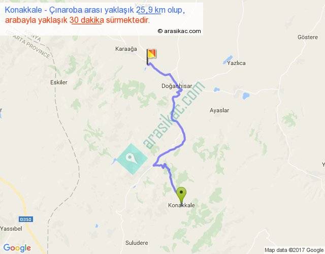 Konakkale - Çınaroba arası yaklaşık olarak 90 km/h ile yukarıda belirtilen sürede olup, iki yerin kuş uçuşu uzaklığı (mesafesi) 17'dir. Yolculuk otobüsle 39 dakika sürmektedir.