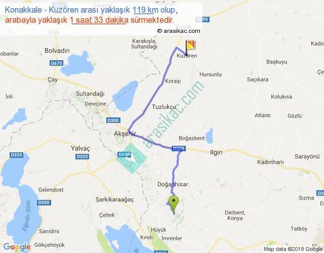 Konakkale - Kuzören arası yaklaşık olarak 90 km/h ile yukarıda belirtilen sürede olup, iki yerin kuş uçuşu uzaklığı (mesafesi) 75'dir. Yolculuk otobüsle 2 saat 0 dakika sürmektedir.