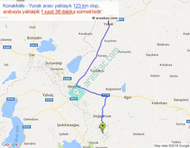 Konakkale - Yunak arası yaklaşık olarak 90 km/h ile yukarıda belirtilen sürede olup, iki yerin kuş uçuşu uzaklığı (mesafesi) 88'dir. Yolculuk otobüsle 2 saat 7 dakika sürmektedir.