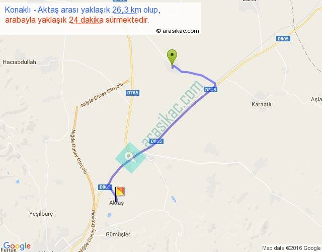 Konaklı - Aktaş arası yaklaşık olarak 90 km/h ile yukarıda belirtilen sürede olup, iki yerin kuş uçuşu uzaklığı (mesafesi) 17'dir. Yolculuk otobüsle 31 dakika sürmektedir.