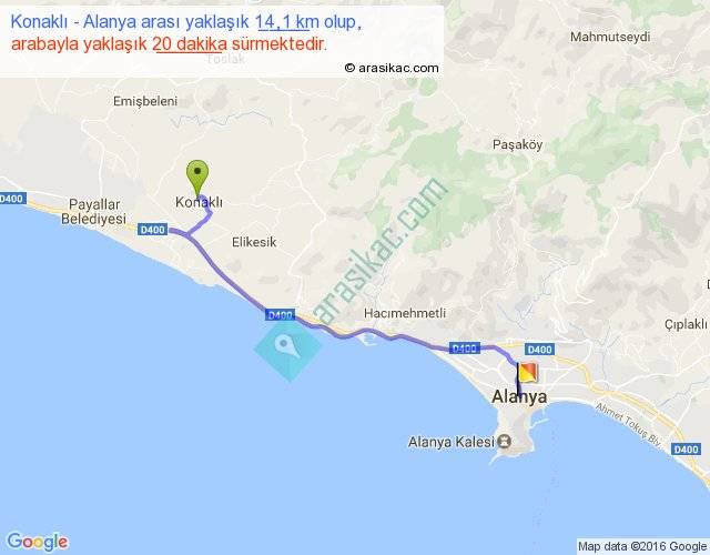 Konaklı - Alanya arası yaklaşık olarak 90 km/h ile yukarıda belirtilen sürede olup, iki yerin kuş uçuşu uzaklığı (mesafesi) 10'dir. Yolculuk otobüsle 26 dakika sürmektedir.
