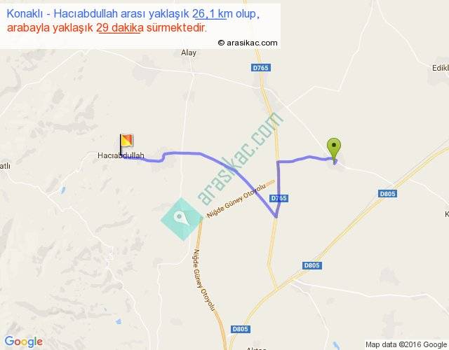 Konaklı - Hacıabdullah arası yaklaşık olarak 90 km/h ile yukarıda belirtilen sürede olup, iki yerin kuş uçuşu uzaklığı (mesafesi) 18'dir. Yolculuk otobüsle 37 dakika sürmektedir.