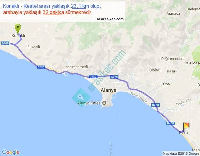 Konaklı - Kestel arası yaklaşık olarak 90 km/h ile yukarıda belirtilen sürede olup, iki yerin kuş uçuşu uzaklığı (mesafesi) 19'dir. Yolculuk otobüsle 41 dakika sürmektedir.