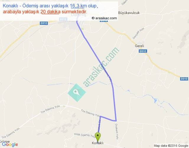 Konaklı - Ödemiş arası yaklaşık olarak 90 km/h ile yukarıda belirtilen sürede olup, iki yerin kuş uçuşu uzaklığı (mesafesi) 13'dir. Yolculuk otobüsle 26 dakika sürmektedir.