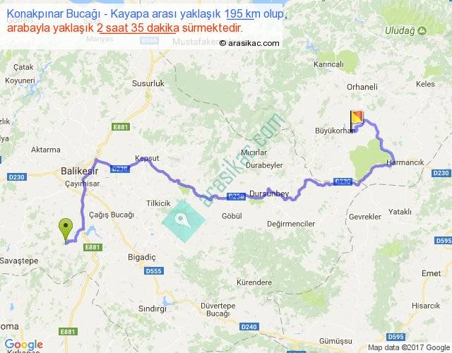Konakpınar Bucağı - Kayapa arası yaklaşık olarak 90 km/h ile yukarıda belirtilen sürede olup, iki yerin kuş uçuşu uzaklığı (mesafesi) 102'dir. Yolculuk otobüsle 3 saat 21 dakika sürmektedir.