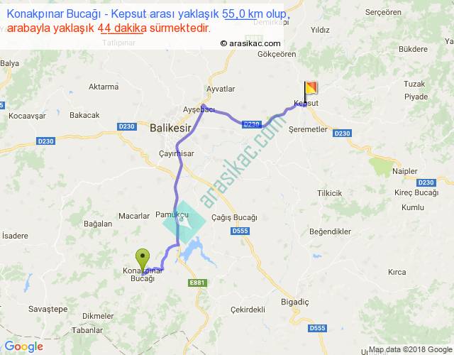 Konakpınar Bucağı - Kepsut arası yaklaşık olarak 90 km/h ile yukarıda belirtilen sürede olup, iki yerin kuş uçuşu uzaklığı (mesafesi) 39'dir. Yolculuk otobüsle 57 dakika sürmektedir.