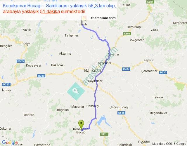 Konakpınar Bucağı - Samli arası yaklaşık olarak 90 km/h ile yukarıda belirtilen sürede olup, iki yerin kuş uçuşu uzaklığı (mesafesi) 42'dir. Yolculuk otobüsle 1 saat 6 dakika sürmektedir.