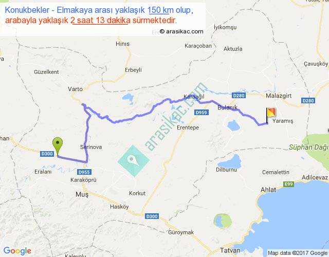 Konukbekler - Elmakaya arası yaklaşık olarak 90 km/h ile yukarıda belirtilen sürede olup, iki yerin kuş uçuşu uzaklığı (mesafesi) 97'dir. Yolculuk otobüsle 2 saat 52 dakika sürmektedir.