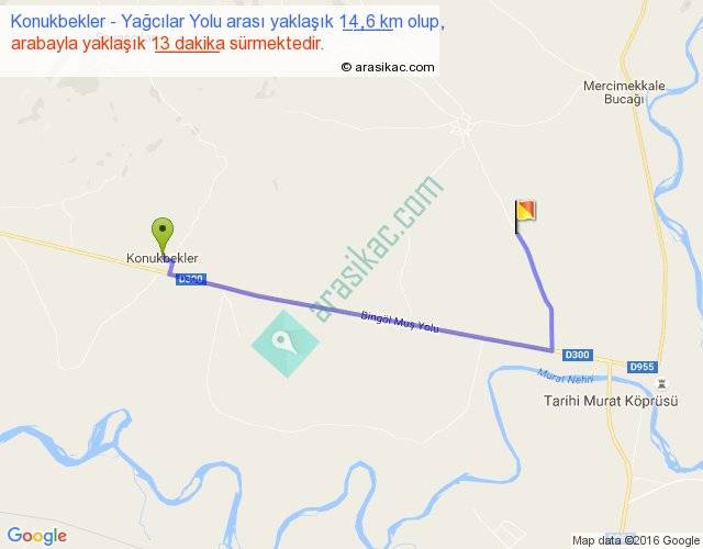 Konukbekler - Yağcılar Yolu arası yaklaşık olarak 90 km/h ile yukarıda belirtilen sürede olup, iki yerin kuş uçuşu uzaklığı (mesafesi) 10'dir. Yolculuk otobüsle 16 dakika sürmektedir.