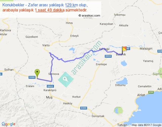Konukbekler - Zafer arası yaklaşık olarak 90 km/h ile yukarıda belirtilen sürede olup, iki yerin kuş uçuşu uzaklığı (mesafesi) 83'dir. Yolculuk otobüsle 2 saat 21 dakika sürmektedir.