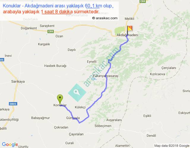 Konuklar - Akdağmadeni arası yaklaşık olarak 90 km/h ile yukarıda belirtilen sürede olup, iki yerin kuş uçuşu uzaklığı (mesafesi) 39'dir. Yolculuk otobüsle 1 saat 28 dakika sürmektedir.