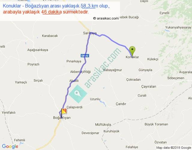 Konuklar - Boğazlıyan arası yaklaşık olarak 90 km/h ile yukarıda belirtilen sürede olup, iki yerin kuş uçuşu uzaklığı (mesafesi) 36'dir. Yolculuk otobüsle 59 dakika sürmektedir.