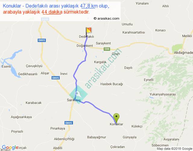 Konuklar - Dedefakılı arası yaklaşık olarak 90 km/h ile yukarıda belirtilen sürede olup, iki yerin kuş uçuşu uzaklığı (mesafesi) 36'dir. Yolculuk otobüsle 57 dakika sürmektedir.