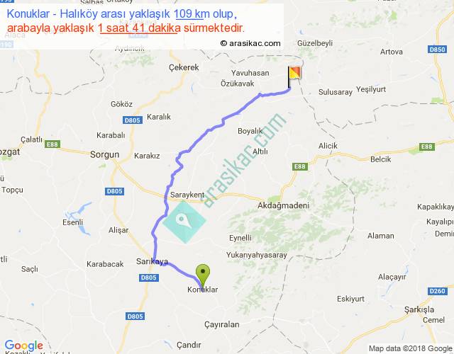 Konuklar - Halıköy arası yaklaşık olarak 90 km/h ile yukarıda belirtilen sürede olup, iki yerin kuş uçuşu uzaklığı (mesafesi) 72'dir. Yolculuk otobüsle 2 saat 11 dakika sürmektedir.
