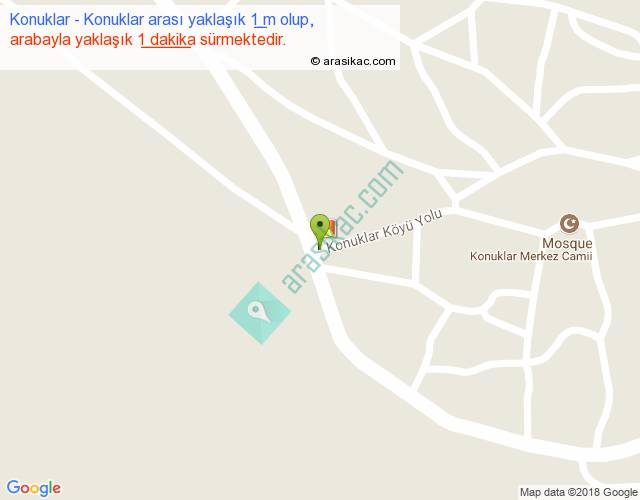 Konuklar - Konuklar arası yaklaşık olarak 90 km/h ile yukarıda belirtilen sürede olup, iki yerin kuş uçuşu uzaklığı (mesafesi) 0'dir. Yolculuk otobüsle 1 dakika sürmektedir.