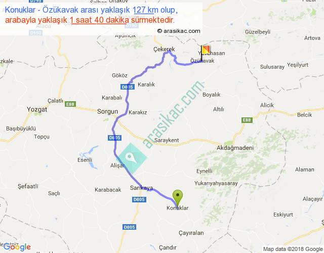 Konuklar - Özükavak arası yaklaşık olarak 90 km/h ile yukarıda belirtilen sürede olup, iki yerin kuş uçuşu uzaklığı (mesafesi) 69'dir. Yolculuk otobüsle 2 saat 10 dakika sürmektedir.