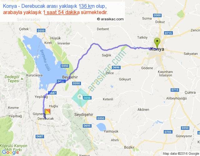Konya - Derebucak arası yaklaşık olarak 90 km/h ile yukarıda belirtilen sürede olup, iki yerin kuş uçuşu uzaklığı (mesafesi) 101'dir. Yolculuk otobüsle 2 saat 28 dakika sürmektedir.