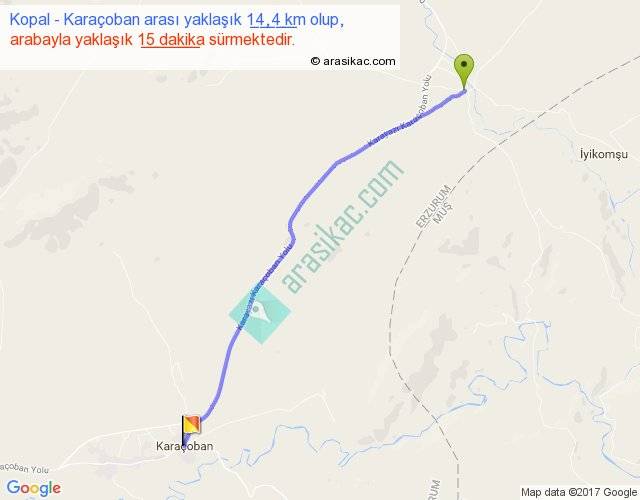 Kopal - Karaçoban arası yaklaşık olarak 90 km/h ile yukarıda belirtilen sürede olup, iki yerin kuş uçuşu uzaklığı (mesafesi) 13'dir. Yolculuk otobüsle 19 dakika sürmektedir.