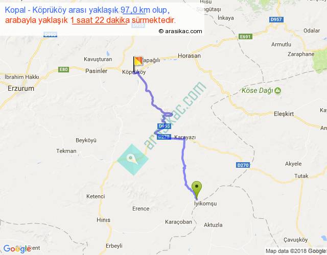 Kopal - Köprüköy arası yaklaşık olarak 90 km/h ile yukarıda belirtilen sürede olup, iki yerin kuş uçuşu uzaklığı (mesafesi) 65'dir. Yolculuk otobüsle 1 saat 46 dakika sürmektedir.