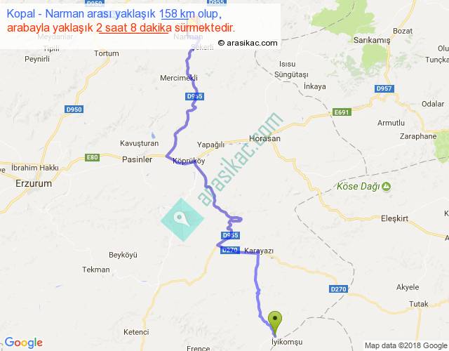 Kopal - Narman arası yaklaşık olarak 90 km/h ile yukarıda belirtilen sürede olup, iki yerin kuş uçuşu uzaklığı (mesafesi) 103'dir. Yolculuk otobüsle 2 saat 46 dakika sürmektedir.