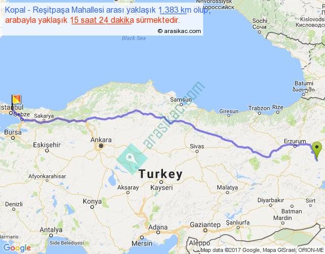 Kopal - Reşitpaşa Mahallesi arası yaklaşık olarak 90 km/h ile yukarıda belirtilen sürede olup, iki yerin kuş uçuşu uzaklığı (mesafesi) 1124'dir. Eğer belirtilen yerler arasında uçak seferi var ise bu süre uçakla 1 saat 43 dakika'ya kadar düşebilir. Yolculuk otobüsle 20 saat 1 dakika sürmektedir.