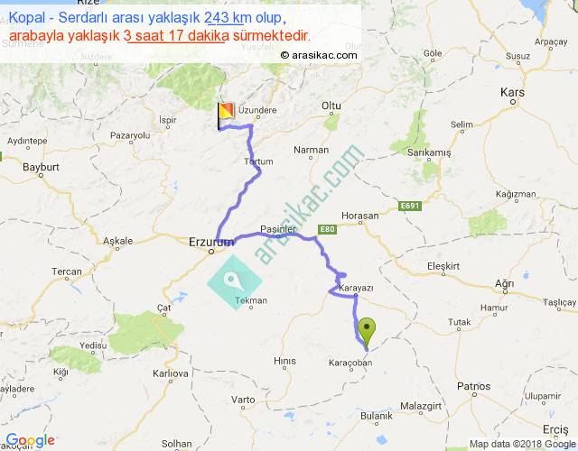 Kopal - Serdarlı arası yaklaşık olarak 90 km/h ile yukarıda belirtilen sürede olup, iki yerin kuş uçuşu uzaklığı (mesafesi) 137'dir. Yolculuk otobüsle 4 saat 16 dakika sürmektedir.