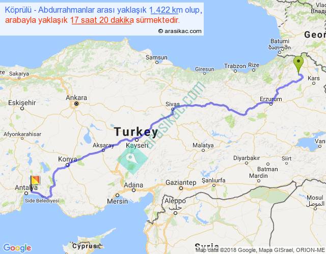 Köprülü - Abdurrahmanlar arası yaklaşık olarak 90 km/h ile yukarıda belirtilen sürede olup, iki yerin kuş uçuşu uzaklığı (mesafesi) 1081'dir. Eğer belirtilen yerler arasında uçak seferi var ise bu süre uçakla 1 saat 39 dakika'ya kadar düşebilir. Yolculuk otobüsle 22 saat 32 dakika sürmektedir.