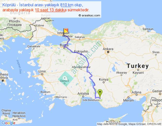 Köprülü - İstanbul arası yaklaşık olarak 90 km/h ile yukarıda belirtilen sürede olup, iki yerin kuş uçuşu uzaklığı (mesafesi) 539'dir. Eğer belirtilen yerler arasında uçak seferi var ise bu süre uçakla 49 dakika'ya kadar düşebilir. Yolculuk otobüsle 13 saat 16 dakika sürmektedir.