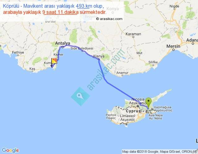 Köprülü - Mavikent arası yaklaşık olarak 90 km/h ile yukarıda belirtilen sürede olup, iki yerin kuş uçuşu uzaklığı (mesafesi) 334'dir. Eğer belirtilen yerler arasında uçak seferi var ise bu süre uçakla 30 dakika'ya kadar düşebilir. Yolculuk otobüsle 11 saat 56 dakika sürmektedir.