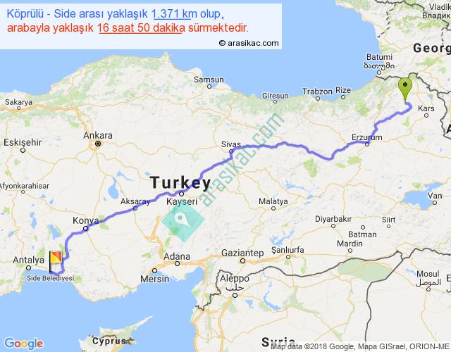 Köprülü - Side arası yaklaşık olarak 90 km/h ile yukarıda belirtilen sürede olup, iki yerin kuş uçuşu uzaklığı (mesafesi) 1055'dir. Eğer belirtilen yerler arasında uçak seferi var ise bu süre uçakla 1 saat 37 dakika'ya kadar düşebilir. Yolculuk otobüsle 21 saat 53 dakika sürmektedir.