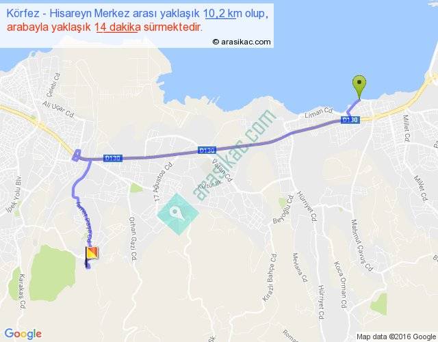 Körfez - Hisareyn Merkez arası yaklaşık olarak 90 km/h ile yukarıda belirtilen sürede olup, iki yerin kuş uçuşu uzaklığı (mesafesi) 7'dir. Yolculuk otobüsle 18 dakika sürmektedir.