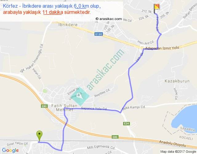Körfez - İbrikdere arası yaklaşık olarak 90 km/h ile yukarıda belirtilen sürede olup, iki yerin kuş uçuşu uzaklığı (mesafesi) 4'dir. Yolculuk otobüsle 14 dakika sürmektedir.
