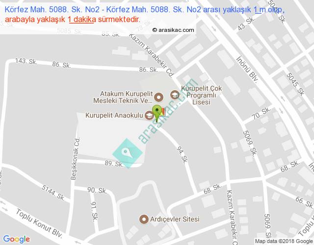 Körfez Mah. 5088. Sk. No2 - Körfez Mah. 5088. Sk. No2 arası yaklaşık olarak 90 km/h ile yukarıda belirtilen sürede olup, iki yerin kuş uçuşu uzaklığı (mesafesi) 0'dir. Yolculuk otobüsle 1 dakika sürmektedir.