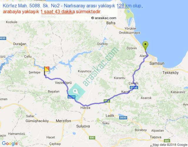 Körfez Mah. 5088. Sk. No2 - Narlısaray arası yaklaşık olarak 90 km/h ile yukarıda belirtilen sürede olup, iki yerin kuş uçuşu uzaklığı (mesafesi) 80'dir. Yolculuk otobüsle 2 saat 13 dakika sürmektedir.