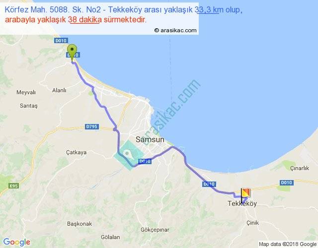 Körfez Mah. 5088. Sk. No2 - Tekkeköy arası yaklaşık olarak 90 km/h ile yukarıda belirtilen sürede olup, iki yerin kuş uçuşu uzaklığı (mesafesi) 25'dir. Yolculuk otobüsle 49 dakika sürmektedir.