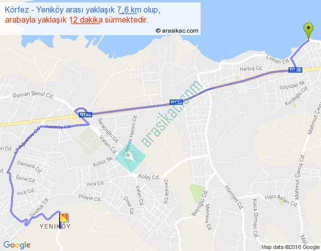 Körfez - Yeniköy arası yaklaşık olarak 90 km/h ile yukarıda belirtilen sürede olup, iki yerin kuş uçuşu uzaklığı (mesafesi) 4'dir. Yolculuk otobüsle 15 dakika sürmektedir.