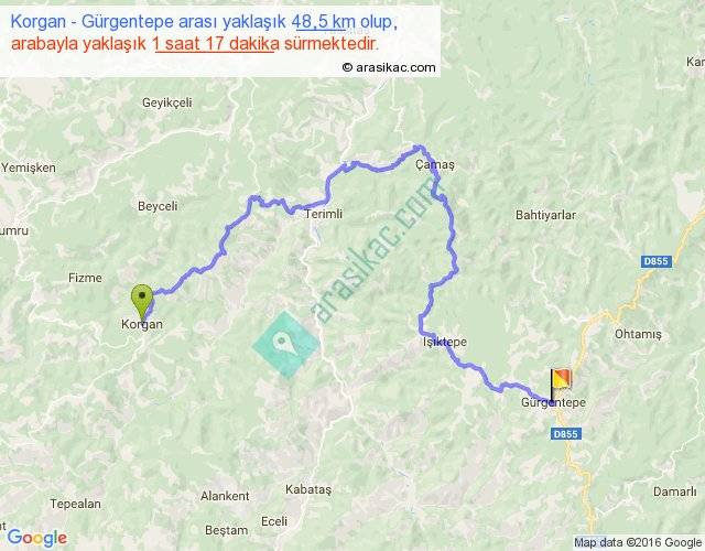 Korgan - Gürgentepe arası yaklaşık olarak 90 km/h ile yukarıda belirtilen sürede olup, iki yerin kuş uçuşu uzaklığı (mesafesi) 22'dir. Yolculuk otobüsle 1 saat 40 dakika sürmektedir.