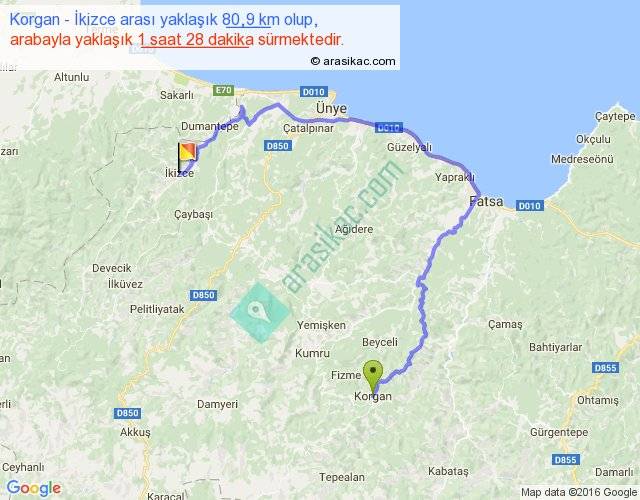 Korgan - İkizce arası yaklaşık olarak 90 km/h ile yukarıda belirtilen sürede olup, iki yerin kuş uçuşu uzaklığı (mesafesi) 34'dir. Yolculuk otobüsle 1 saat 54 dakika sürmektedir.